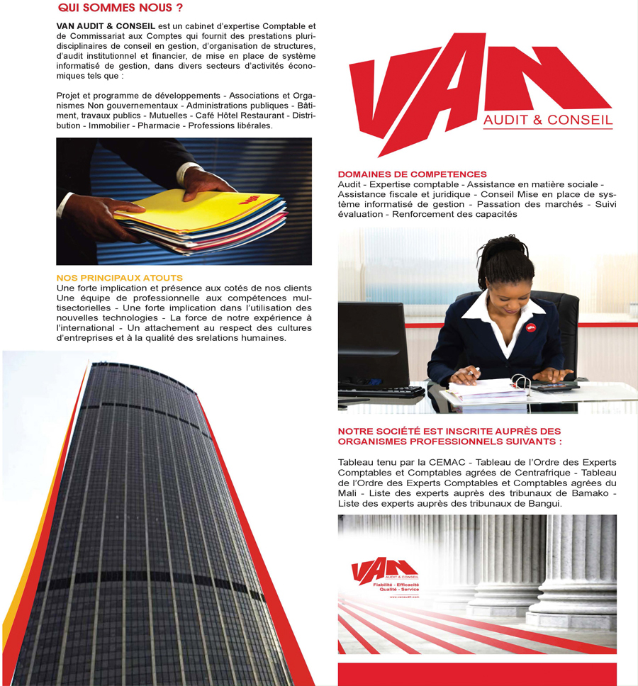 VAN AUDIT & CONSEIL est un cabinet d’expertise Comptable et de Commissariat aux Comptes qui fournit des prestations pluridisciplinaires de conseil en gestion, d’organisation de structures, d’audit institutionnel et financier, de mise en place de système informatisé de gestion, dans divers secteurs d’activités économiques.